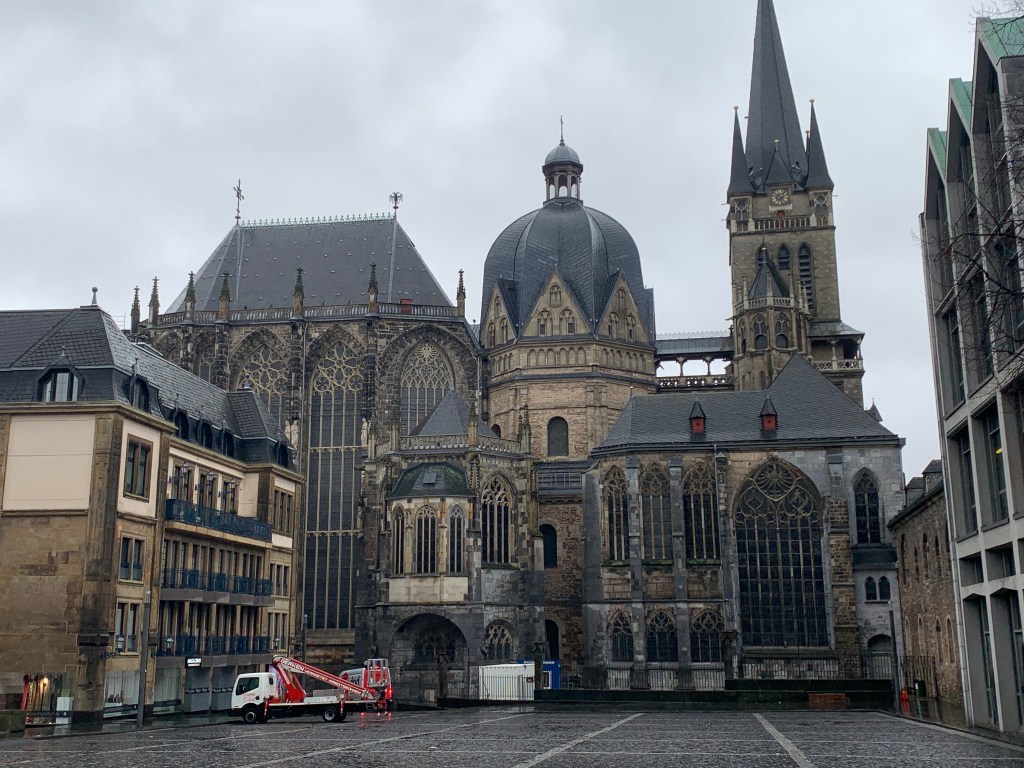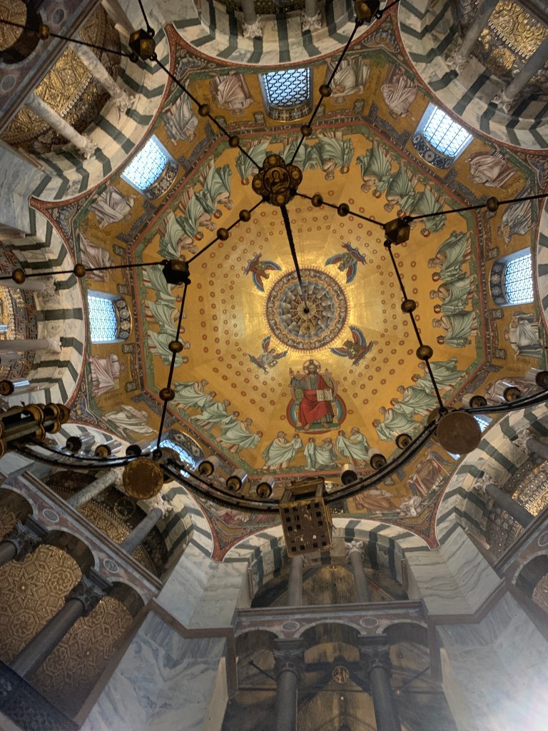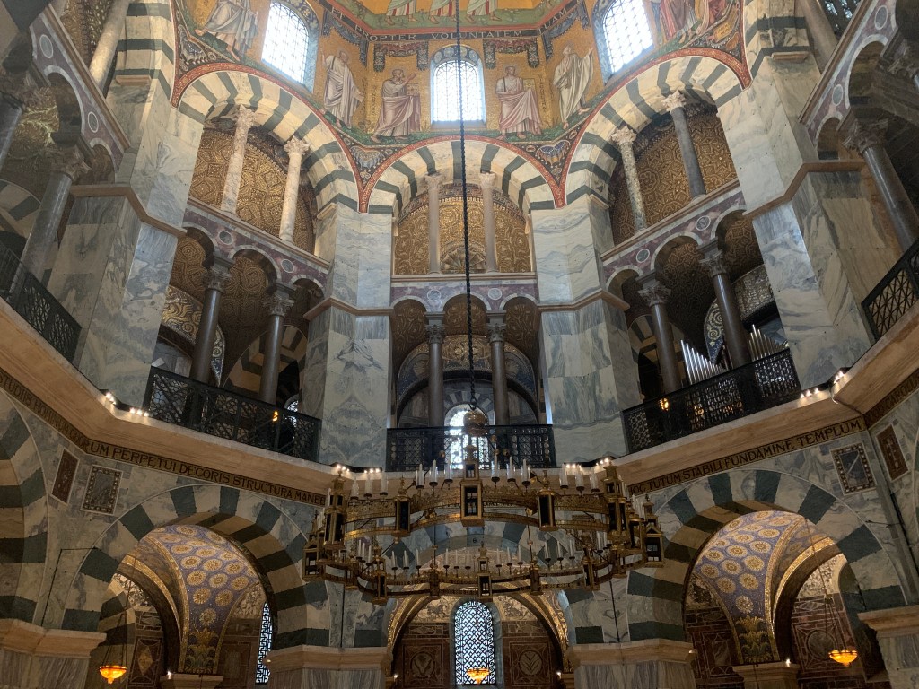 Karl den stores rike ble såpass stabilt og oppegående at det hadde ressurser til å skape noe nytt. Og det er her domkirken i Aachen kommer inn i historien. Romerrikets fall innebar også at det skjede lite på arkitekturens område, kirker som ble bygd i Vest-Europa på 3-600-tallet var mest bleke etterligninger etter romertidens byggeskikk. Karl den store sørget for at det ble bygd en ny kirke som både representerte noe nyskapende, samtidig som det henter inspirasjon fra både klassiske, bysantiske og germansk tradisjoner. Dette 1200 hundre år gamle bygget står fortsatt som en kjerne i domkirken i Aachen, og er rett og slett imponerende; der søyler, buer og kuppel er sentrale elementer. Denne kirken og keiseranlegget for øvrig i Aachen fikk stor betydning for utviklingen en egen vesteuropeisk arkitektur i middelalderen, bl.a. for utviklingen av de typiske romanske steinkirkene vi kjenner fra norsk middelalder.