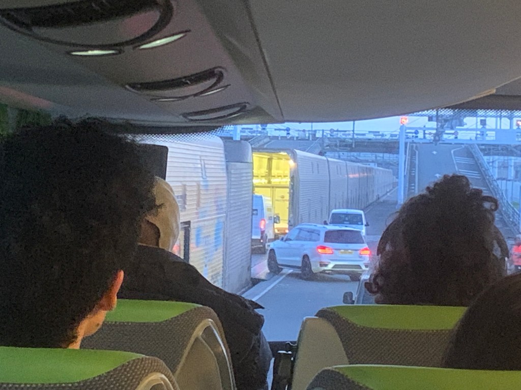 Jeg tok toget til Lille i Frankrike med togbytte i Gent. Jeg ble forelsket i Gent sommeren 2022, og dit skal jeg tilbake. Nå rakk jeg bare ut i stasjonenbygget og ta bilde av de fine taket. Jeg satset på å ta en båt fra Calais om ettermiddagen hvis alt klaffet med toget. Det gjorde det ikke. Da jeg kom til Lille fikk jeg høre at toget til Calais ikke gikk pga streik (mot heving av pensjonsalderen). Dermed rakk jeg ikke siste ferje over kanalen den kvelden. Etter diverse nettsøk fant jeg en tredje løsning når både tog og båt over kanalen sviktet; det går alltid en buss. Jeg rakk å kjøpe den siste plassbill. på Flexbus sin rute fra Brussel til London. Dermed ble det buss for tog – men på tog. Det er jo kun tog som kjører over kanalen, men de har togvogner som tar imot biler, trailere og busser (se bildet). Jeg hadde gledet meg til å sitte i en godstol i et høyhastighetstog i 350 km/h under kanalen, i stedet satt jeg i en trang buss inne i et slags godstog. Og det var svært mye venting pga flere passkontroller og sjekking før vi kunne kjøre ombord på togvognen. Så det ble seint før jeg kom fram til London. Der overnattet jeg på et hostel et sted mellom Chelsea og Kensington.