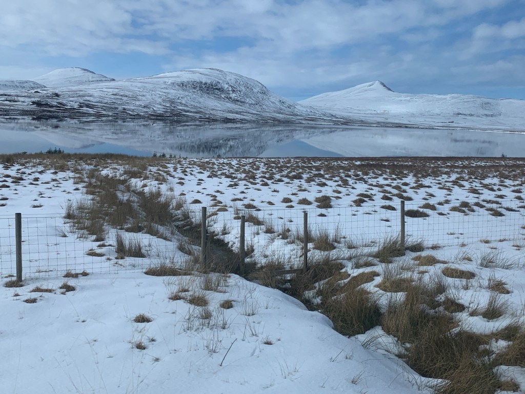 Etter en lunsj og en visitt på biblioteket tok jeg toget til Inverness. All den flotte naturen jeg kjøre forbi i mørket kvelden før åpenbarte seg nå. Landskapet var ganske åpent med åser og små topper på kanskje 500 moh. Mye sauer som beiter, selv om det ligger snø på marka. Lite skog, noe av landskapet minner om det en finner på Island.