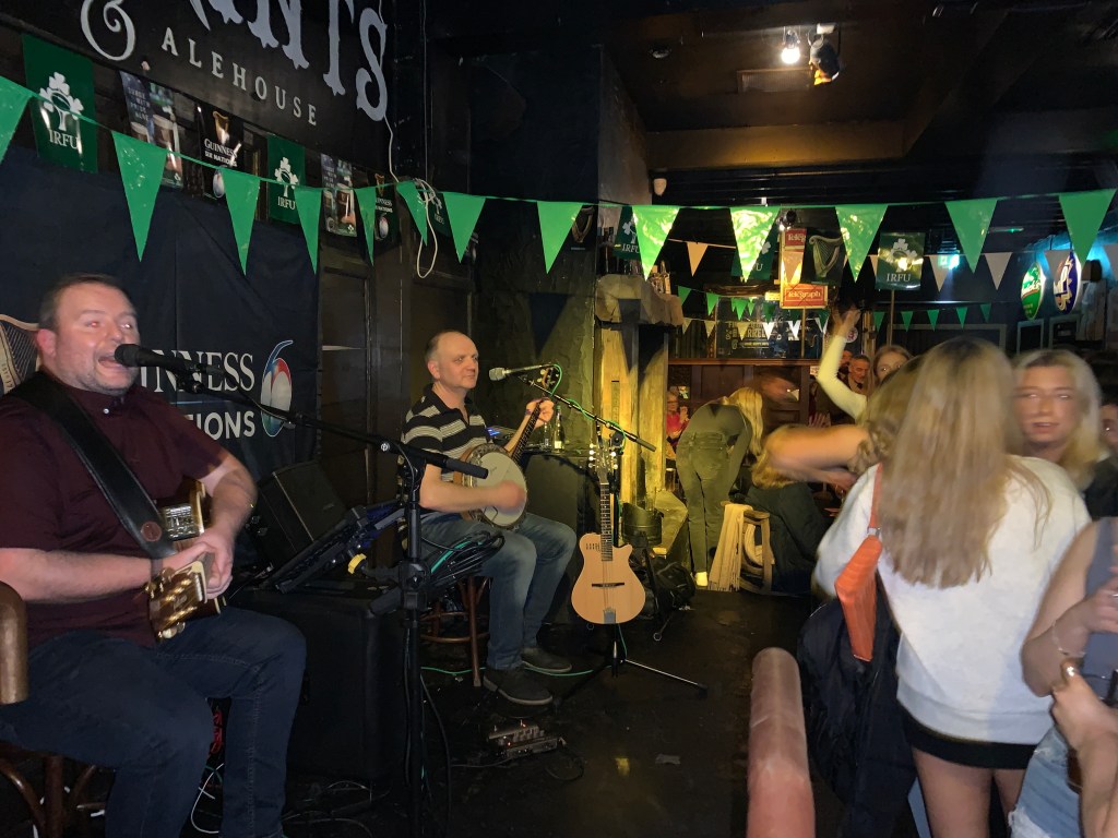Etter innlosjering på et enkelt og sentralt hostel (Lagan backpackers Belfast) hadde jeg behov for å komme meg ut på byen, og ble anbefalt et sted som het The Points i Dublin Road. Og det var innertier. Her var det irsk folkemusikk, dans og allsang. Og stappende fullt av festglade irer. Etter hvert skjønte jeg at det var kvelden før St Patricks day, noe som gjorde at det var ekstra mye folk på byen. Jeg kjøpte meg en irsk whisky og en irsk pale ale, og det var lett å hygge seg sammen med festende irer.