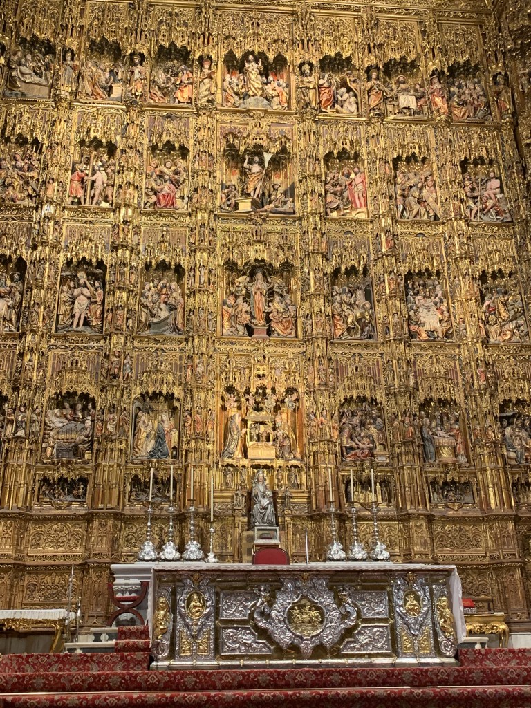 Dette er tydelig i møte med katedralen i Sevilla. Det er verdens 3. største kirke, og er en vakker gotisk katedral som rommer masse kunst og annen prakt. Den har bl.a. verdens største altertavle som det tok 80 år å fullføre. Den er dekket med gull, og står der både som et kunstnerisk mesterverk – og som et sterkt uttrykk for kolonitidens brutalitet. Det kan være kort vei fra skjønnhet til at noe er groteskt. Denne streken ble krysset for meg i møte med denne gedigne gullveggen midt inne i kirka. I tillegg er hele alteorområdet dekket av et stort jerngitter. Dette gitteret blir for meg et sterkt symbol på at all prakten stenger for den fortellingen den egentlig ønsket å formidle.