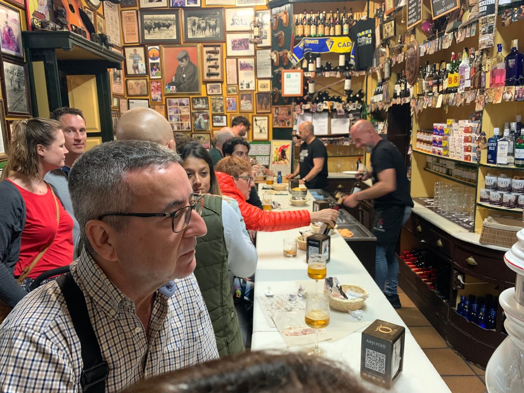 Om kvelden spiste vi på en tapas-bar som heter Taverna Casa Manteca, og lå ikke så langt fra stranda. Her var det stappfullt, og en herlig stemning der alle de mindre tapasrettene ble sendt rundt i stort tempo. Intenst og morsomt!