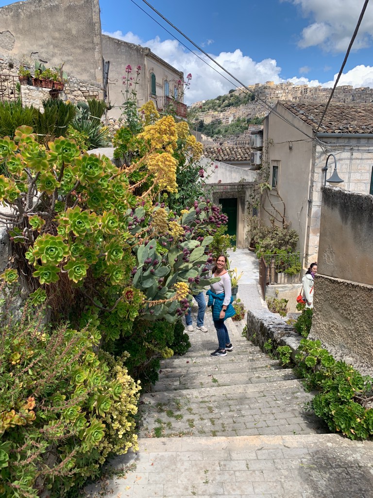 Vi tok lokaltog fra Siracusa til Modica, som er en by litt inn i landet helt sør på Sicilia (april 2023). Her ble vi møtt av våre venner Daniella og Stein Erik, som har et hus i dette området. Og her skulle vi være et døgn sammen hos dem. Daniella har vokst opp på Sicilia, og med henne som vert fikk vi mer innblikk i denne øya, og i tillegg smake på noe av øyas gode spesialiteter. Vi fikk bl.a. spise Pasta con le Sarde (sardinpasta), artisjokker, ovnsstekte sardiner og salchicha. De har en tomt der vi bl.a. høstet appelsiner og laget frisk juice. Her lærte vi også om mandeltre, johannesfrukt og dyrking av oliven.