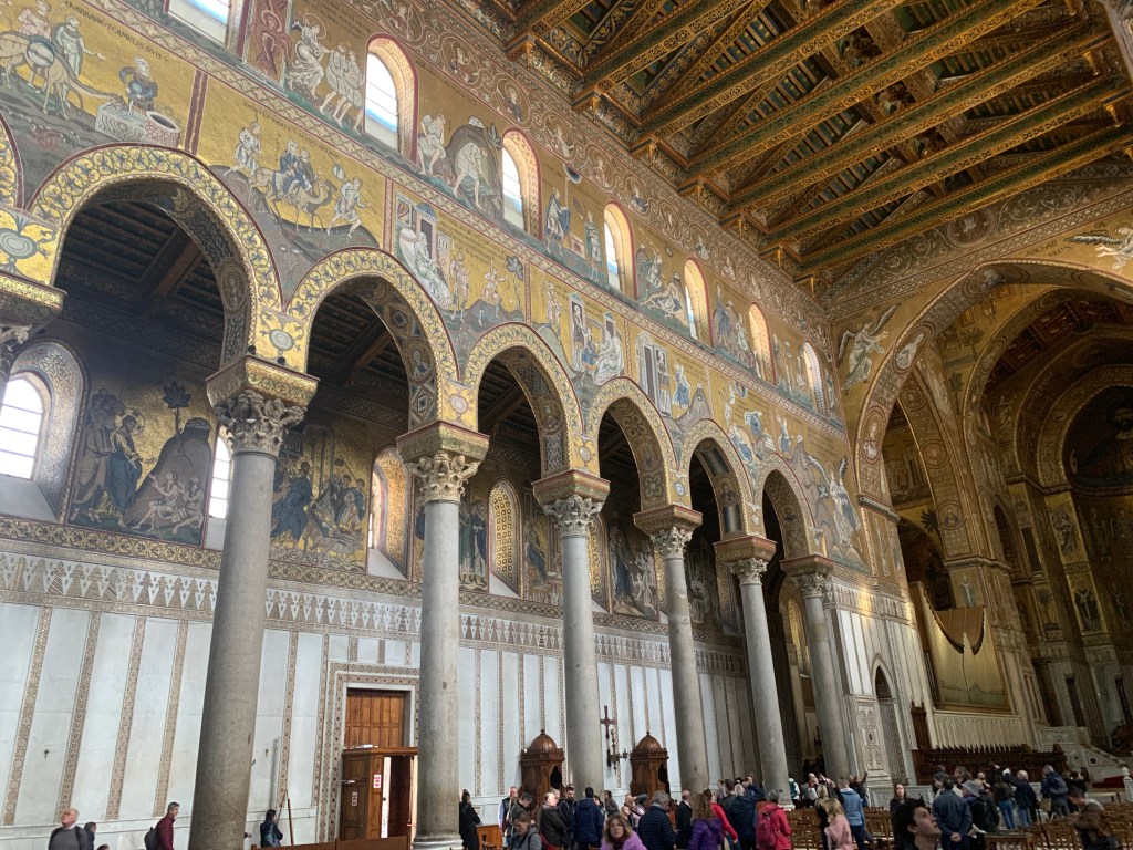 På 1100-tallet ble arbeidet med dagens katedral i Monreale igangsatt. Denne kirken er unik på flere måter. Den har en særegen utforming med både bysantiske, arabiske og normanniske stilelementer. I tillegg er kirken utsmykket med fantastiske mosaikkmotiver som ennå er godt bevart 800 år etterpå, og den har verdens største bronsedør fra middelalderen. Rett ved katedralen er lå det et stort benediktiner-kloster som var sentralt under «gjenkristningen» av Sicilia. Her besøkte vi bl.a. en unik klosterhage med særegne søyleganger (se bilde nedenfor). Fra Monreale var det en flott utsikt over hele Palermo.