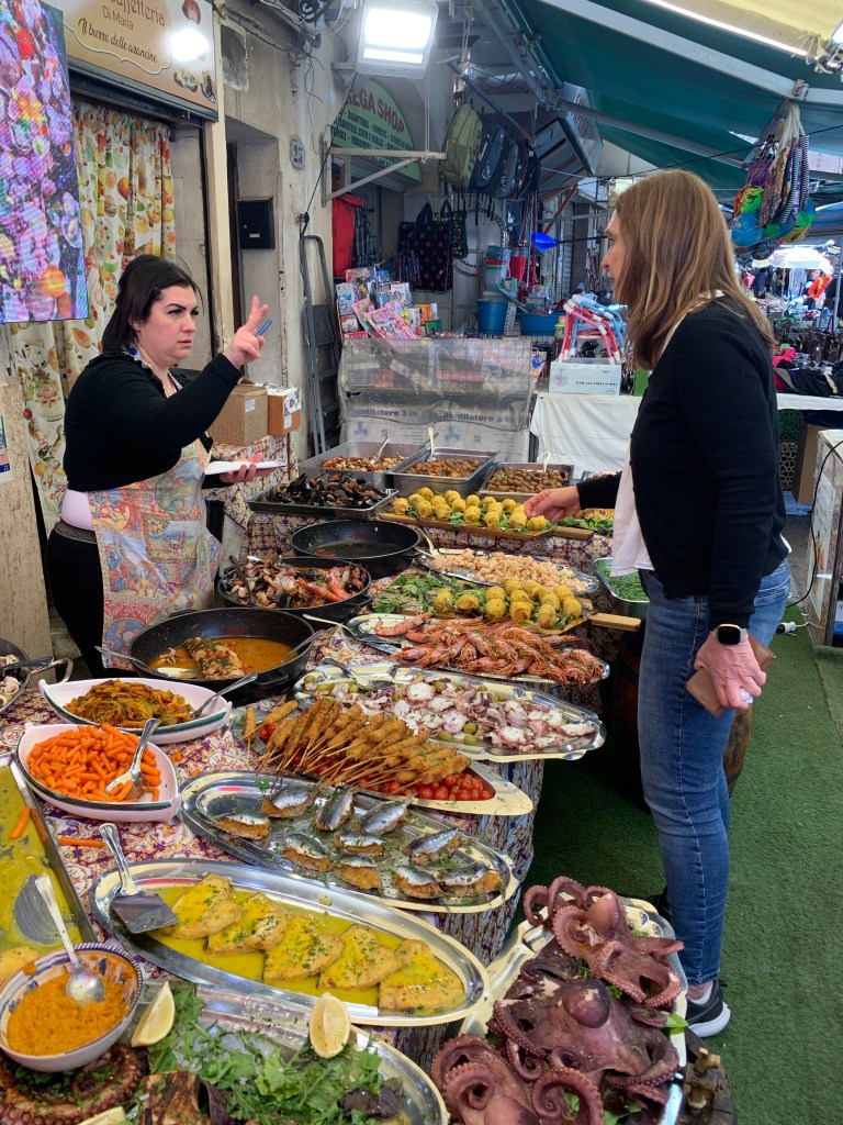Palermo har et stort matmarked, og dette besøkte vi ved lunsjtider. Her var det både alt mulig godt av gode råvarer i alle kategorier, street-food og spisesteder der du pekte på ulike retter du kunne kjøpe. Vi prøvde flere spesialiteter fra Sicilia, bl.a. stekte sardiner, en særegen risbolle og blekksprutsalat. Jeg antar at det norske Mattilsynet hadde brukt opp batteriet hvis de skulle ha inspisert noen av disse bodene, men de fleste hadde lagt fram maten på en lekker og innbydende måte. Og matmarkedet var stort; det gikk over flere kvartaler
