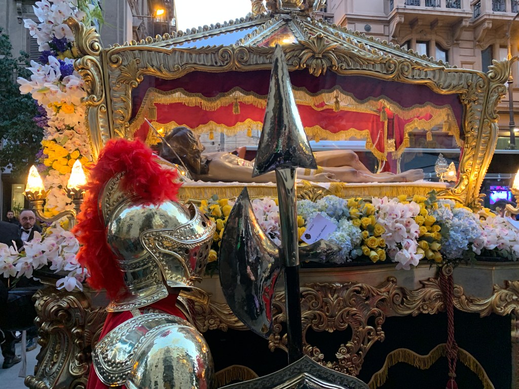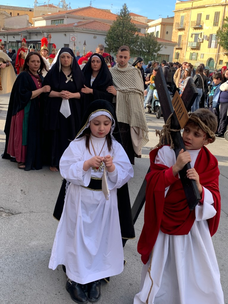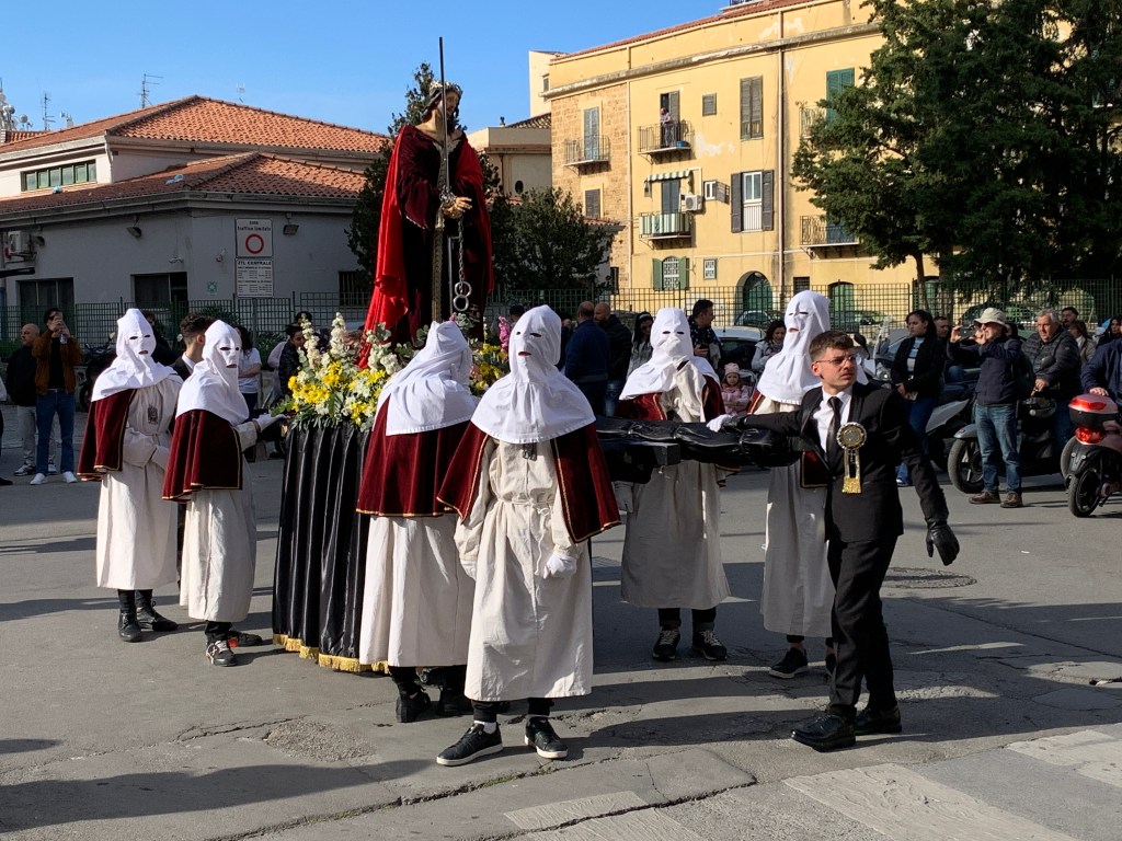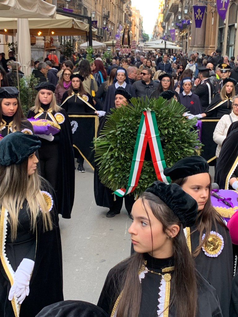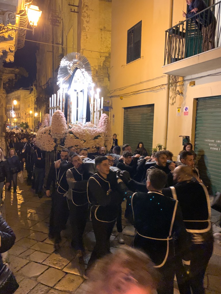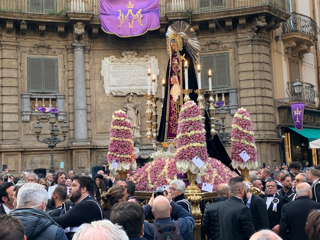 Dette var langfredag, og vi hadde hørt om at Palermo har store prosesjoner på denne dagen. Vi etterlyste et «program» over når og hvor disse prosesjonene gikk, men det var vanskelig å få tak i systemet. Vi fant ut at det var lettere å gå etter lyden. Det er ulike kirker og kongregasjoner som har hver sine prosesjoner, og de gikk på kryss og tvers i gamlebyen i Palermo. Etter hvert skjønte vi at det var et mønster: Først i prosesjonen kom et korps som spilte tung sørgemusikk. Deretter noen grupper av barn eller andre med enten uniformer, drakter eller kledd ut som ulike aktører i langfredagshistorien, gjerne bærende med ulike gjenstander, f.eks. tornekronen, hammer og spiker mv. Deretter bar svartkledde menn en tung flåte med en utsmykket og blomsterdekket «glasskiste» der det lå en lidende Jesusfigur inni. Denne flåten var så tung at 20-25 menn bar svært tungt når den skulle bevege seg. De bar den kanskje 25-50 meter, så satte de den ned igjen, etter en pause gikk de videre. Dermed gikk prosesjonen svært sakte framover. Litt lenger bak kom det en ny flåte med en svært pyntet Mariafigur. Til slutt gikk folk flest, rolig og alvorlig. Siden det var mange slike prosesjoner bare i gamlebyen i Palermo preget det hele byen. Det var mye folk på alle restauranter og barer, men stemningen i hele byen var preget av langfredag.