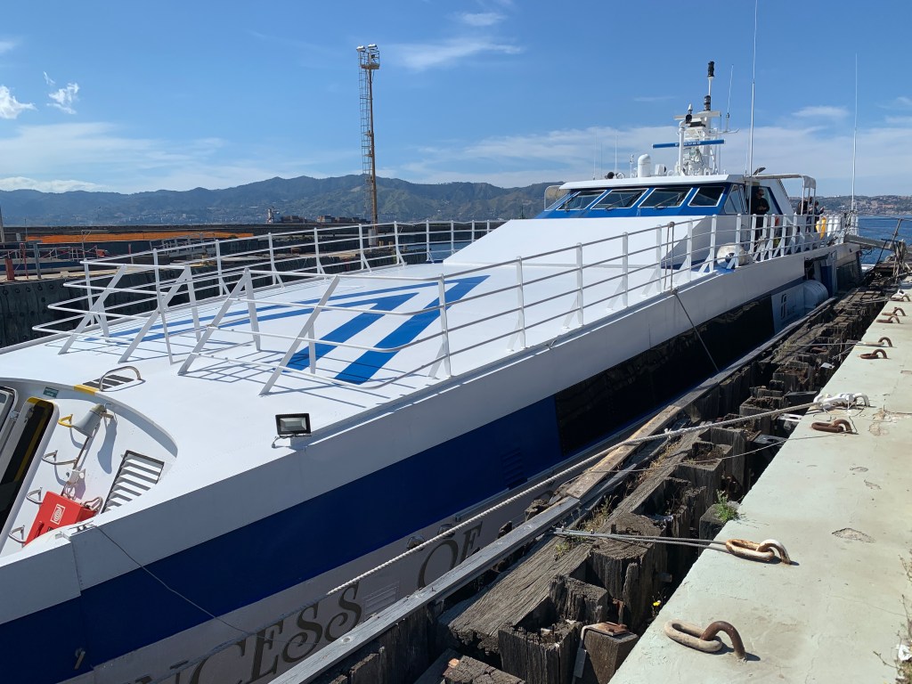 Vi startet dagen med en togtur på tre timer langs nordkysten på Sicilia til Messina. Denne byen ligger helt øst på Sicilia, og er ferjeleie for alle som skal til/fra Sicilia fra fastlandet. Da jeg ble bedt om å vise pass i bagasjeoppbevaringen i Messina fant jeg ikke passet. Ble ganske stressa. Kanskje det lå igjen på hotellet i Palermo? Tone ringte, og etter litt styr meldte de tilbake at de ikke fant noe pass. Stresset økte, og jeg undersøkte gjennom bagasjen for tredje gang. Da dukket passet opp på en rar plass i kofferten. Stor lettelse og glede!