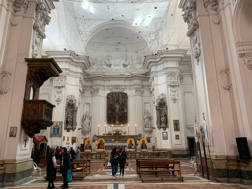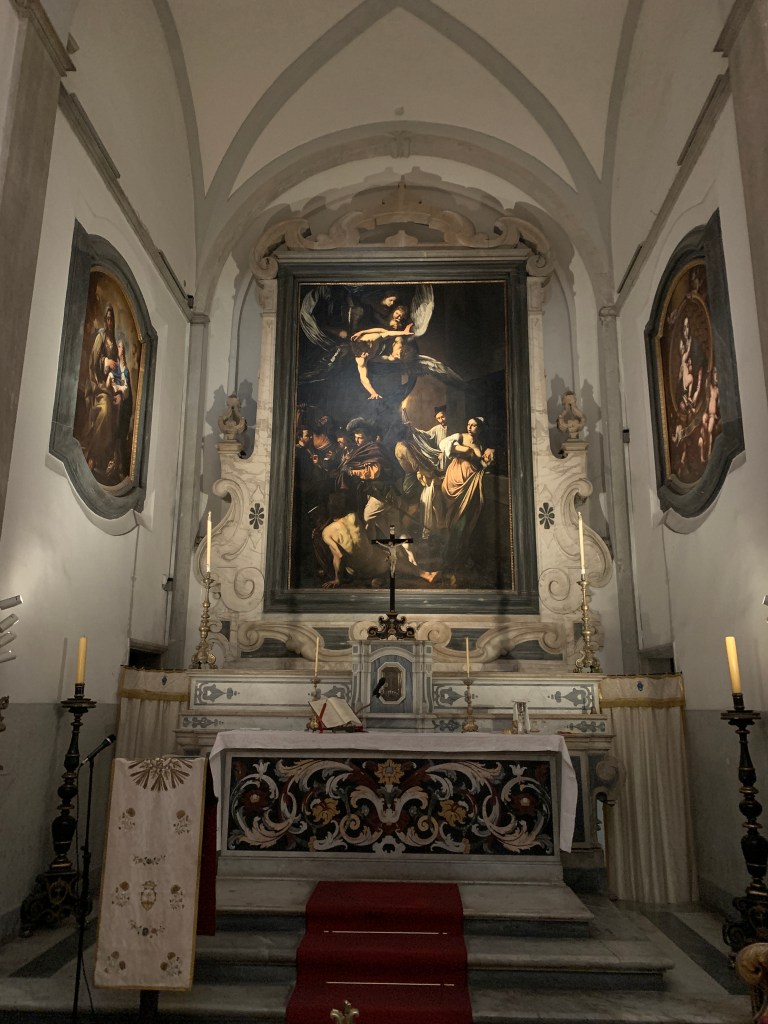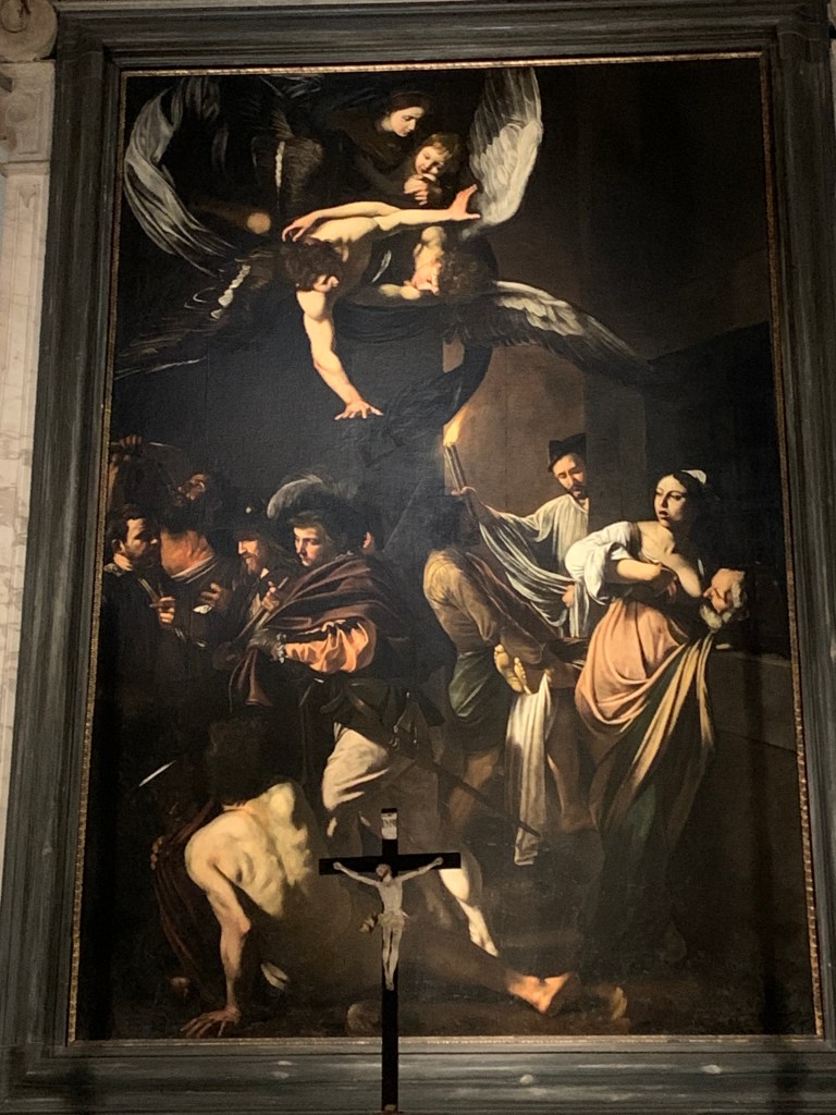 Mitt prosjekt for dagen handlet om Caravaggio og reising (april 2023). Vårt forsøk på å se det 3. og siste Caravaggio-bildet i går lykkes ikke pga stengte dører. Jeg tok med meg koffertsekken min og dro avgårde denne formiddagen i håp om at det var åpent nå. Og vandringen gjennom trange gater med bagasje var ikke forgjeves! Kirka var åpen.