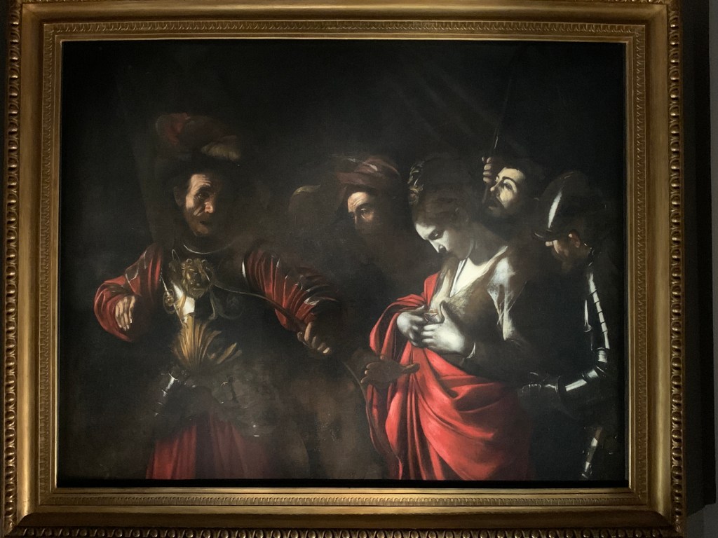 Napoli har tre Caravaggio-bilder, fordelt på 2 museer og en kirke, og da var disse tre stedene fine peilepunkter for byvandringen. Da vi kom ned til byen opplevde vi en by stappfull av folk. De færreste framsto som turister, og vår tese er at etter rolige dager i den stille uke var det nå tid for å møtes ute og treffe folk på byen. Vår vandring gikk bl.a. langs sjøen på vestsiden av byen. En plan om bading ble droppet da vi så de lite egna forholdene. På den store Piazza del Plebiscito så jeg bannere med et bilde av Carravaggio. Det viste seg at et Caravaggio-bilde var med med på en temautstilling på slottsmuseet rett ved (Palazzo Reale). Dermed fikk vi med oss både et Caravaggio-bilde – og samtidig se hvordan kongene i Napoli levde på 17- og 1800-tallet. Jeg må innrømme at overdådighet i gull og stæsj i rokokko berører meg svært lite. Det oppleves mest som posering av egen rikdom og makt. Overpyntet og glorete. Av samme grunn blir jeg mest oppgitt når jeg kommer inn i barokk-kirker der det dynges på med gull og annen overflod. Det andre Caravaggiobildet var i et ordinært museum, mens det tredje bildet var i en kirke som var stengt på 1. påskedag. Napoli