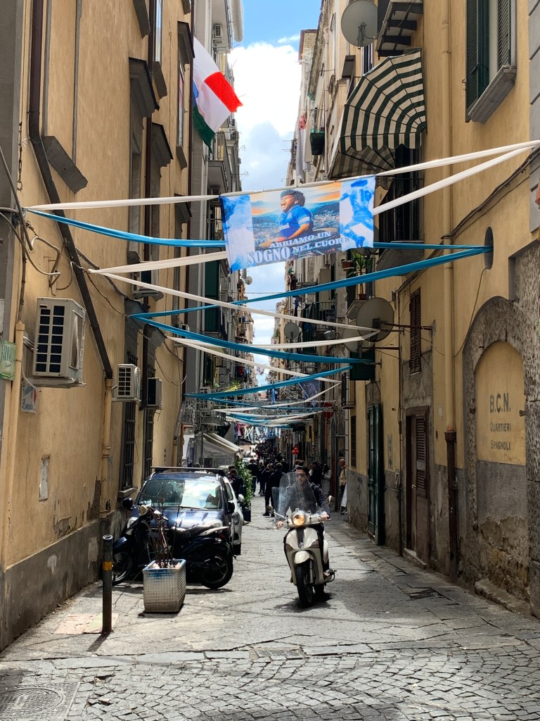 Vi gikk bl.a. gjennom den delen av det historiske sentrum som kalles det spanske kvarter (Quartieri Spagnoli), og det er herlig trangt og eksotisk med alle slags butikker og restauranter, Selvsagt er det mye pizza, vi er tross alt i pizzaens hjemby. Bybildet er for øvrig mye preget irriterende mopeder og av fargene til fotballklubben Napoli. Klubben er byens stolthet, og den leder nå den italienske serie A. Gatene hadde masse lenker i Napolis farger hengene på kryss og tvers. Klubben ble for alvor stor og kjent da Maradona var på laget fra 1984 til 1991. I gatene ser vi fortsatt en rekke bilder mv av Maradona. Da han døde i 2020 gikk det 4 dager til stadion i Napoli ble oppkalt etter han.