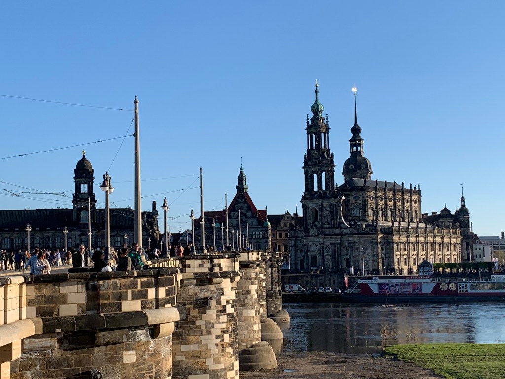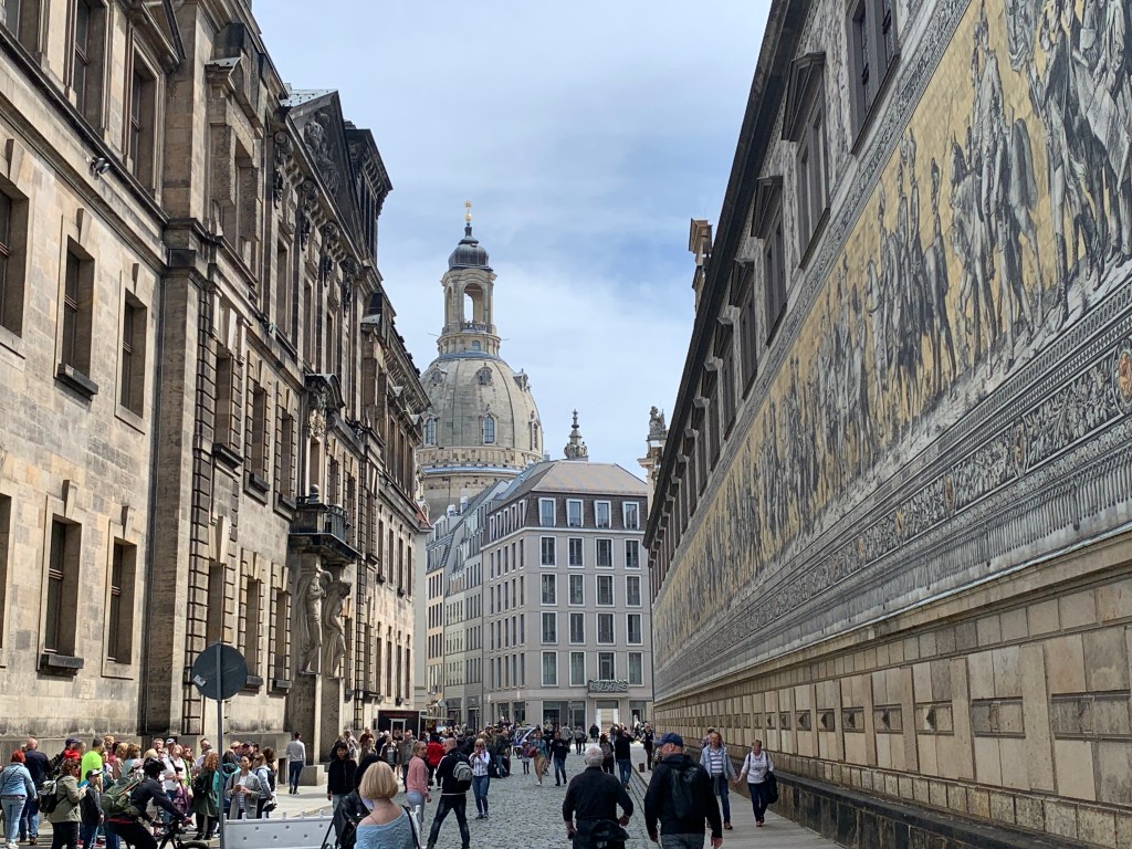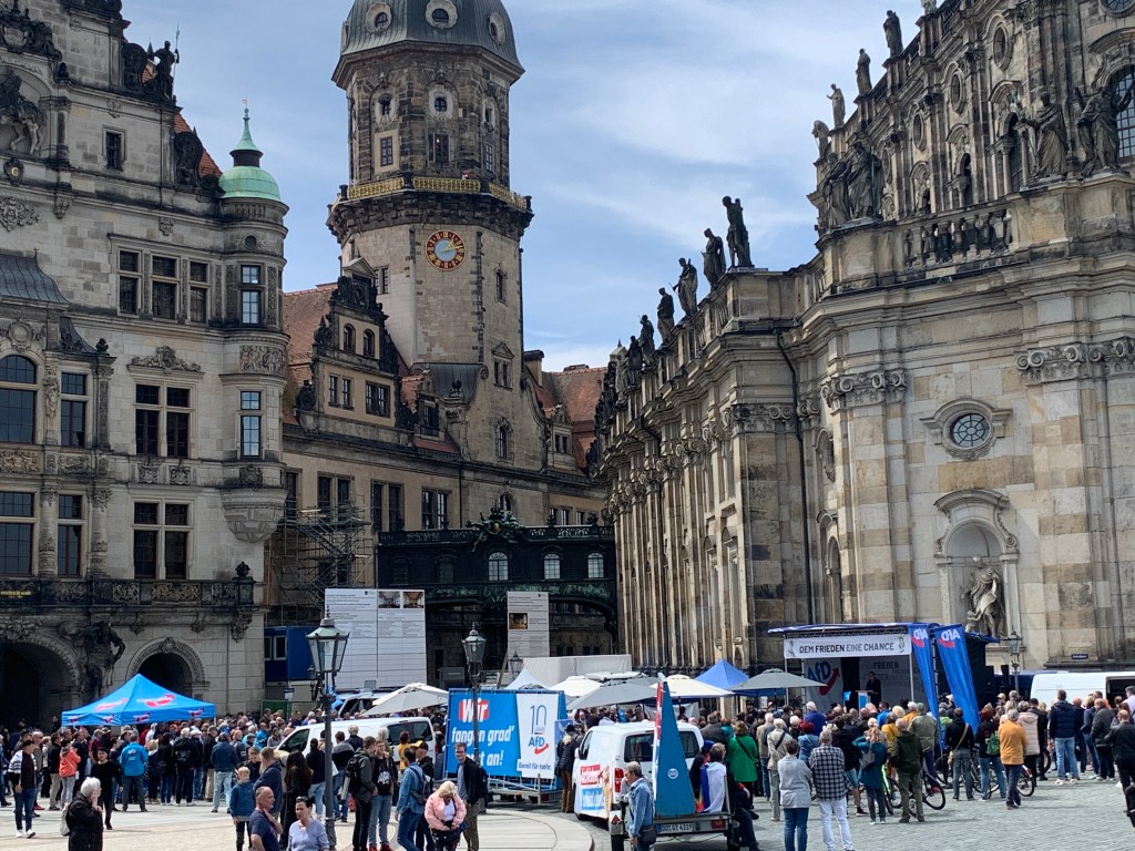 På turen gjennom Neustadt og ned til Altstadt var mye folk ute i gatene og i parkene, men det eneste jeg møtte denne dagen med politisk farge var et folkemøte for AfD, det store tyske høyreradikale partiet (Alternativ für Deutchland). Dette partiet har rystet tysk politikk på linje med det Sverigedemokratene har gjort i Sverige. Og AdD har størst oppslutning i de områdene som tidligere hørte til DDR, ikke minst i Dresden-området i sør-øst-Tyskland. De kom for fullt inn i Forbundsdagen ved valget i 2017 da de ble det tredje største partiet. De gikk imidlertid tilbake ved valget i 2021, da de kun ble det 5. største partiet. Folkemøte jeg passerte hadde heller ikke så stor oppslutning, det var kanskje et par hundre tilhørere som prøvde å klappe og skape stemning – uten helt å lykkes. Jeg håper det er et tegn på at den høyreradikale vinden har løyet litt i dette området.