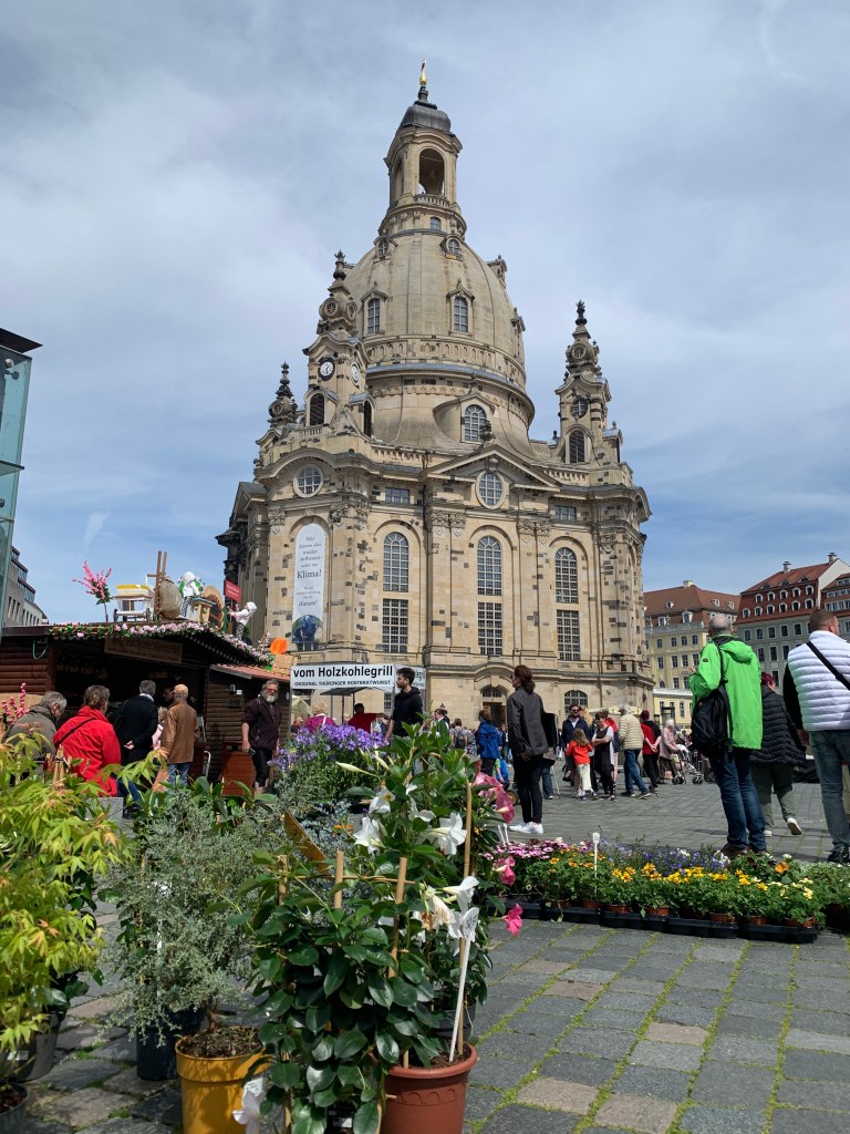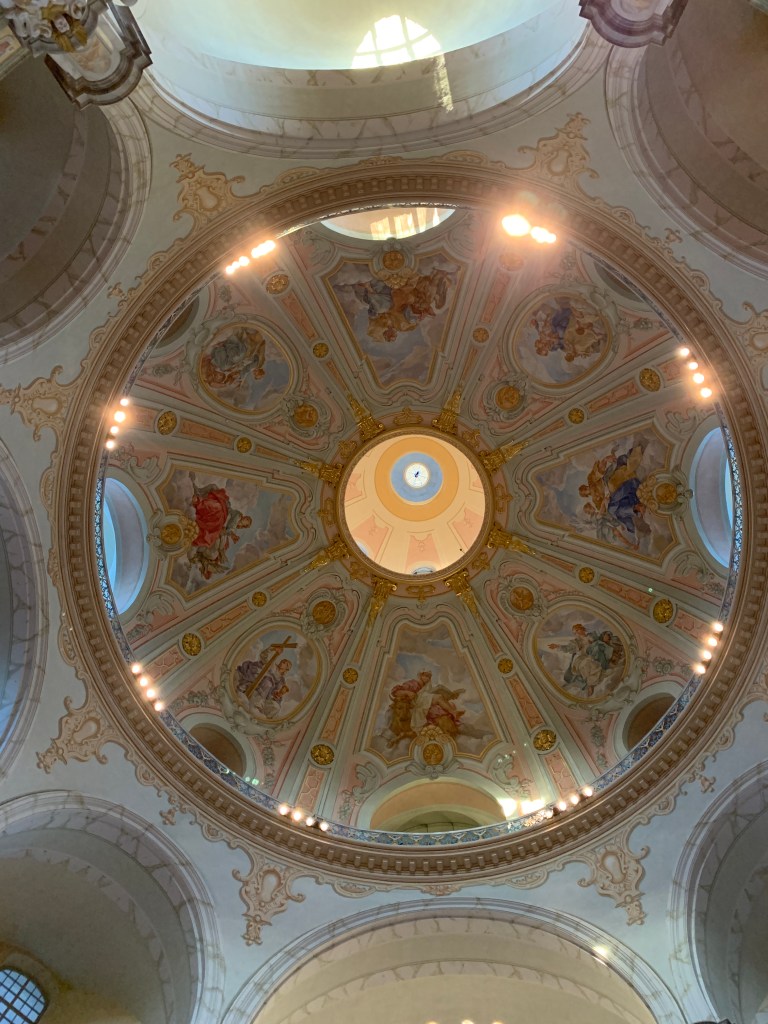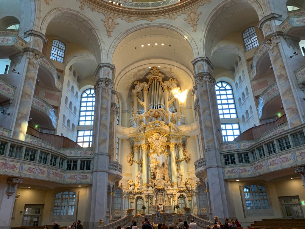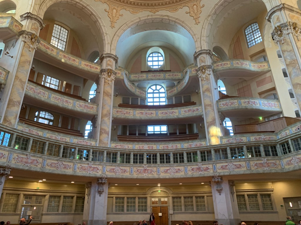 Jeg må innrømme at jeg fikk ambivalente følelser når jeg kom inn i denne kirken. De positive følelsene handler om at det er flott å få tilbake et såpass spesielt historisk bygg, og det ligger sterk symbolikk i å gjenreise et bombet kirkebygg fra ruinene. Bygget bidrar også til å få tilbake enda mer komplett det historiske sentrum i Dresden, og det har gitt denne delen av tidligere DDR mer stolthet. De mer kritiske stemmene i meg opplever det litt «Disney-land»-akitg å bygge en kopi av en 300 år gammel kirke. I tillegg er kirken innvendig malt i pastell-farger, og sammen med den litt svulstige barokk-stilen gir det meg en følelse av cupcakes og overpyntet marsipankake. Jeg korrigerer meg selv med stemmer som sier at fargebruken kunne være ganske sterk i mange historiske bygg, og at vi i dag møter disse fargene mest i bleket utgave med alders patina. Kanskje er de sterke pastellfargene mer autentiske enn det vi møter i de fleste andre eldre bygg? Uansett – et slikt bygg setter i gang mange tanker om autensitet, smak og arkitektur som historiefortelling.