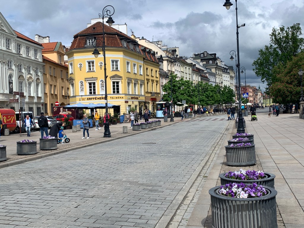 Langs gata Krakowskie ligger det en rekke gjenoppbygde flotte bygg som bidrar til å knytte byen tilbake til tida før nazistenes ødeleggelser. En gang var Warszawa er vakker kulturby med flott arkitektur, og mange av disse er gjenoppbygd slik de var før krigen. Langs gata ligger flere kirker, presidentpalasset, universitet, vitenskapsakademi, teatre osv. Og selvsagt butikker og restauranter. En flott hovedgate der det er lagt godt til rette for gående. Gata ender ved det store slottet og en gjenoppbygd middelalderbydel. Kunnskapen om at dette bare var en grushaug i 1945 kan svekke opplevelsen av autensitet, men det var visst dyktige fagfolk som bidro til at gjenoppbyggingen skjedde ved bruk av materialer og håndverk mv fra de bygga som sto der tidligere. Denne delen av Warszawa har fått plass på UNESCOs verdensarvliste som en anerkjennelse av den grundige gjenoppbyggingen. Disse byggende forteller uansett en historie om Polen og den store kulturnasjon de var før nazisme og sovjetkommunisme fikk herje fritt.
