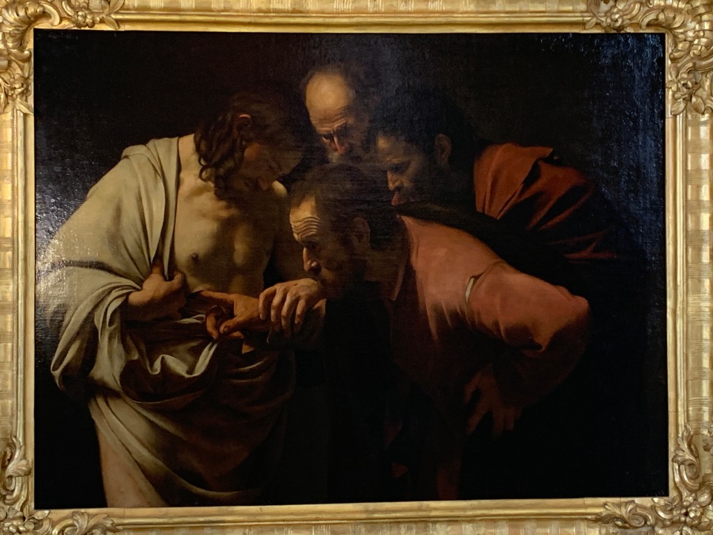 Fra Wannsee dro jeg med s-bahn videre til Potsdam sentrum. Her besøkte jeg malerisamlingen til tilknytning til Schloss Sanssouci. Selve utstillingslokalet er rokokko på sitt beste/verste, og på veggen hang bilder tett i tett i 4 høyder. Dette er oppskriften på dårlig formidling av kunst, men sikkert i tråd med praksis på 1700-tallet da museet ble etablert. Jeg kom for å se på et Caravaggio bilde av Thomas tvileren, et bilde som overlevde krigen uten skader. 2 andre bilder av Caravaggio i Berlin ble helt ødelagt under 2. verdenskrig. Dette bildet er et av de flotteste av Caravaggio. Det viser Thomas som møter Jesus etter oppstandelsen, og har en intensitet og tydelig nærvær. Alle de andre Caravaggio-bildene jeg har sett på denne turen har blitt vist fram på en måte som har understreket bildet. Her skjer det motsatte; bilder drukner litt i et rom som er overfylt av både 100 andre malerier, mye lys, og distraherende rom for øvrig.