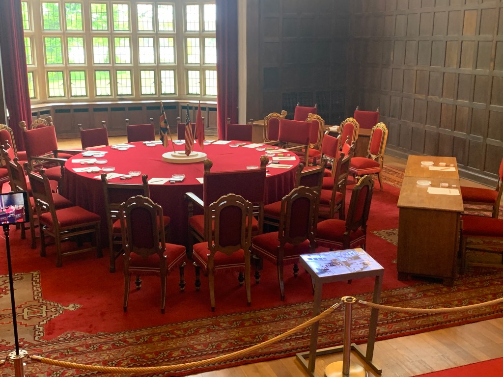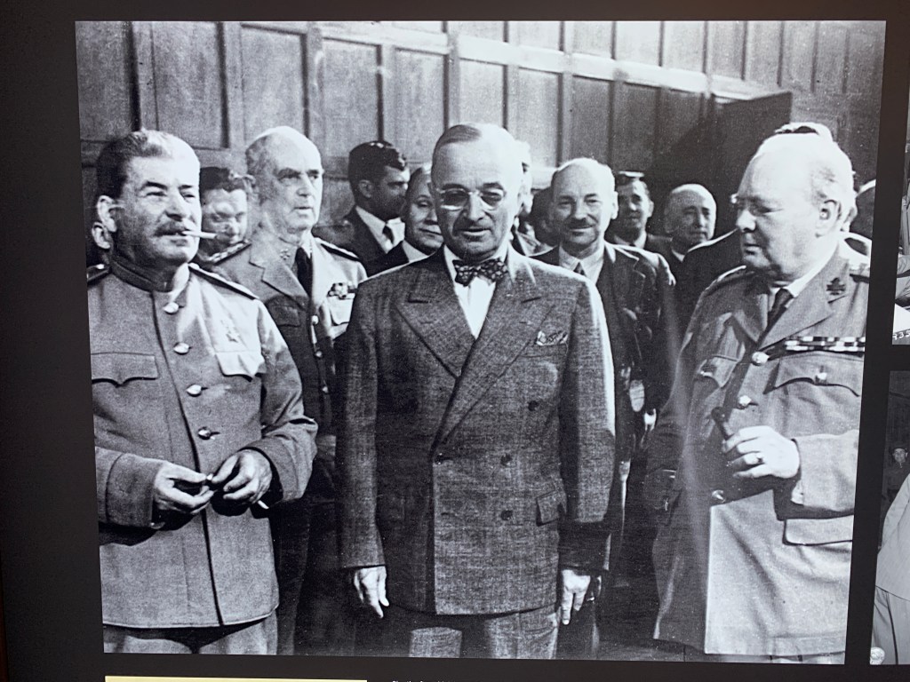 Potsdam er kanskje mest kjent for Potsdam-konferansen. Dette var et møte i juli/august 1945 mellom de 3 seiersmaktene etter 2 verdenskrig; Stalin, Churchill og Truman. Her kom de fram til avtaler for hvordan det skulle gå for krigens tapernasjoner, og da særlig Tyskland. Gjennom Potsdamavtalen ble Tysklands nye grenser fastsatt, noe som bl.a. innebar at mye av Tysklands tidligere områder i øst ble overført til Polen (bl.a. Wraclaw/Breslau). Avtalen legitimerte at tyskere ble utvist fra Tsjekkia og Ungarn, og at Sovjet overtok Køningsberg. (nåværende Kaliningrad mellom Polen og Litauen). Denne konferansen foregikk over mange dager, og forhandlingene skjedde i et tidligere prinseresidens som jeg besøkte. Dette var nå et museum der mye av inventaret fra 1945 fortsatt var på plass, bl.a. det store runde forhandlingsbordet. Jeg fikk også se på de 3 private kontorene som ble stilt til rådighet for de tre statslederne under besøket.