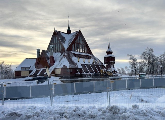 Jeg planla å besøke kirken, men møtte høye gjerder og skilt med adgang forbudt. Det viste seg at kirka ble stengt sommeren 2024, og at forberedelsene til flytting var i gang. De skal bl.a. legge jernbjelker under hele kirken som fundament for flyttingen. Kirka veier 600 tonn, og jernbjelkene som den skal hvile på veier også 600 tonn. Dermed er det 1 200 tonn som skal ut på tur gjennom byen sommeren 2025. Kirka er 40 x 40 meter i bredde, og flyttingen krevet bredere veier enn i dag, bruer må erstattes med fyllinger, og noen hus må rives. Da blir det sikkert tv-overføring av flytting av kirke – minutt for minutt. (Mer om flyttingen og bilder av Kiruna kirke her: https://www.tidinord.no/2024/04/flytting-av-kiruna-kirke.html