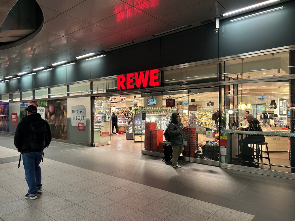 Matbutikk med brød og melk og alt slikt (Lebensmittel) REWE i 1. underetsje, vestiden (UG 1)